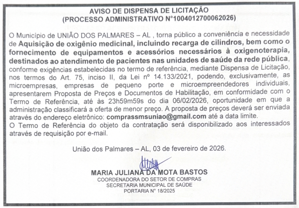 Modalidade/Nº: Concorrência nº 03/2026 – Tipo: Menor Preço – Regime: Empreitada Por Preço Unitário – Objeto: Contratação de empresa especializada para execução de serviços de engenharia referente a CONSTRUÇÃO DE ESCOLA 13 SALAS, PADRÃO FNDE– NO MUNICÍPIO DE UNIÃO DOS PALMARES/AL, no Município de União dos Palmares– Data/Horário: 02 de março de 2026 às 10:00hs (dez horas) – O Edital em inteiro teor encontra-se disponível no site: http://bnc.org.br/, no portal do município, através do site http://www.uniaodospalmares.al.gov.br, no endereço sede da Prefeitura localizada na Rua Marechal Deodoro da Fonseca, Centro, CEP 57.800-000, em dias úteis, no horário das 08 às 13 horas, ou por meio eletrônico, mediante solicitação enviada ao e-mail: licitacoes@uniaodospalmares.al.gov.br.