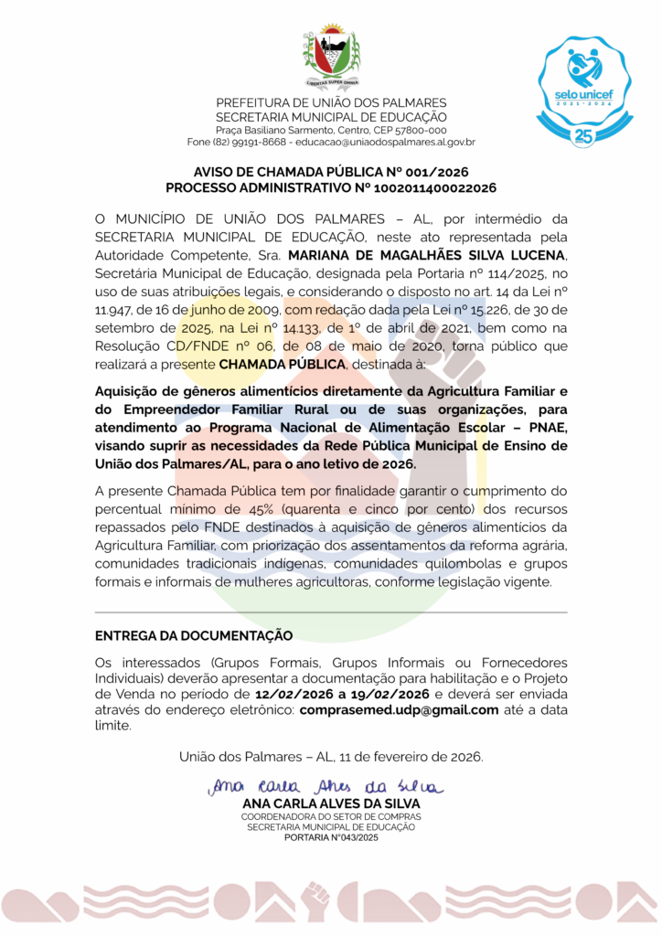 AVISO DE CHAMADA PÚBLICA Nº 001/2026 PROCESSO ADMINISTRATIVO Nº 1002011400022026 Publicado por semedem 11 de fevereiro de 2026em LICITAÇÕES 0 comentários