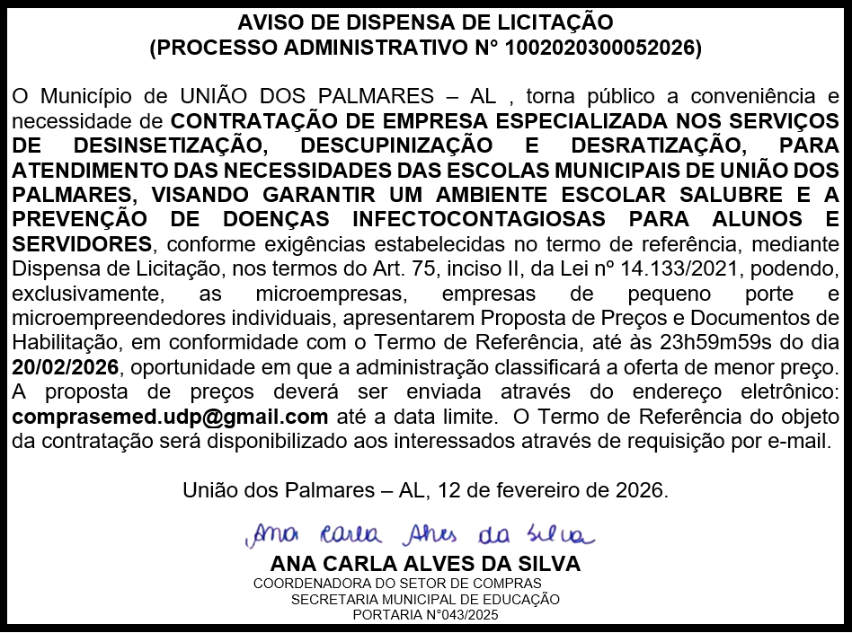 Modalidade/Nº: Concorrência nº 03/2025-1 – Tipo: Melhor oferta – Objeto: Contratação de Instituição Bancária para Centralização e Processamento da Folha de Pagamento dos Servidores Públicos – Data/Horário: 06 de março de 2026 às 10:00hs (dez horas) – O Edital em inteiro teor encontra-se disponível no site: http://bnc.org.br/, no portal do município, através do site http://www.uniaodospalmares.al.gov.br, no endereço sede da Prefeitura localizada na Rua Marechal Deodoro da Fonseca, Centro, CEP 57.800-000, em dias úteis, no horário das 08 às 13 horas, ou por meio eletrônico, mediante solicitação enviada ao e-mail: licitacoes@uniaodospalmares.al.gov.br.