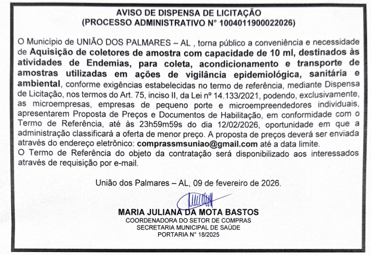 AVISO DE DISPENSA DE LICITAÇÃO Publicado por Compras Saúdeem 9 de fevereiro de 2026em LICITAÇÕES (PROCESSO ADMINISTRATIVO N°1004011900022026) LICITAÇÕES