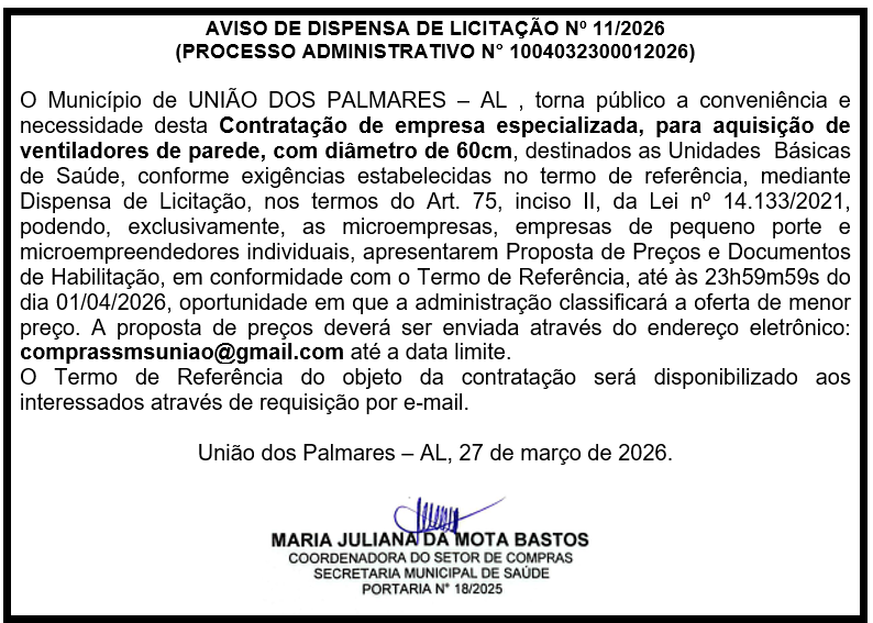 AVISO DE DISPENSA DE LICITAÇÃO Nº 11/2026 Publicado por Compras Saúdeem 27 de março de 2026em LICITAÇÕES (PROCESSO ADMINISTRATIVO N° 1004032300012026) LICITAÇÕES