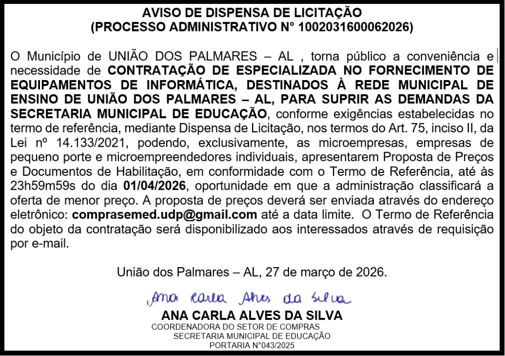 AVISO DE DISPENSA DE LICITAÇÃO PROCESSO Nº 1002031600062026 Publicado por semedem 27 de março de 2026em LICITAÇÕES LICITAÇÕES