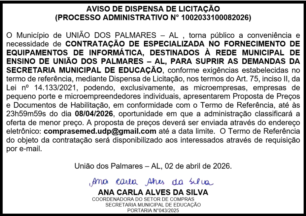 AVISO DE DISPENSA DE LICITAÇÃO PROCESSO Nº 1002033100082026 Publicado por semedem 2 de abril de 2026em LICITAÇÕES LICITAÇÕES