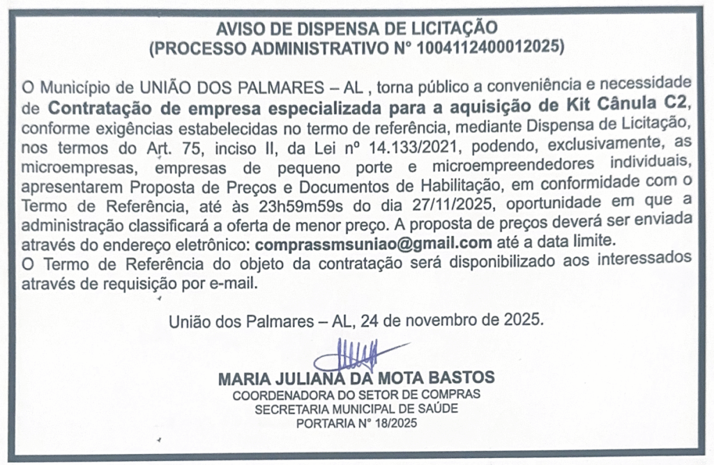 O MUNICÍPIO DE UNIÃO DOS PALMARES – AL, através da SECRETARIA DE MUNICIPAL DE ASSISTÊNCIA SOCIAL, com sede na Rua Dr Antônio Arecipo, Centro, CEP-57800-00, inscrita no CNPJ/MF sob n° 14.761.041/0001-05, torna público para conhecimento dos interessados a realização DISPENSA DE LICITAÇÃO DE KITS DE ENXOVAL, com critério de julgamento MENOR PREÇO GLOBAL, nos termos do Art. nº 75, inciso II da Lei 14.133/2021, e de acordo com as condições, critérios e procedimentos estabelecidos neste Aviso e seus anexos, objetivando obter a melhor proposta, observadas as datas e horários discriminados.