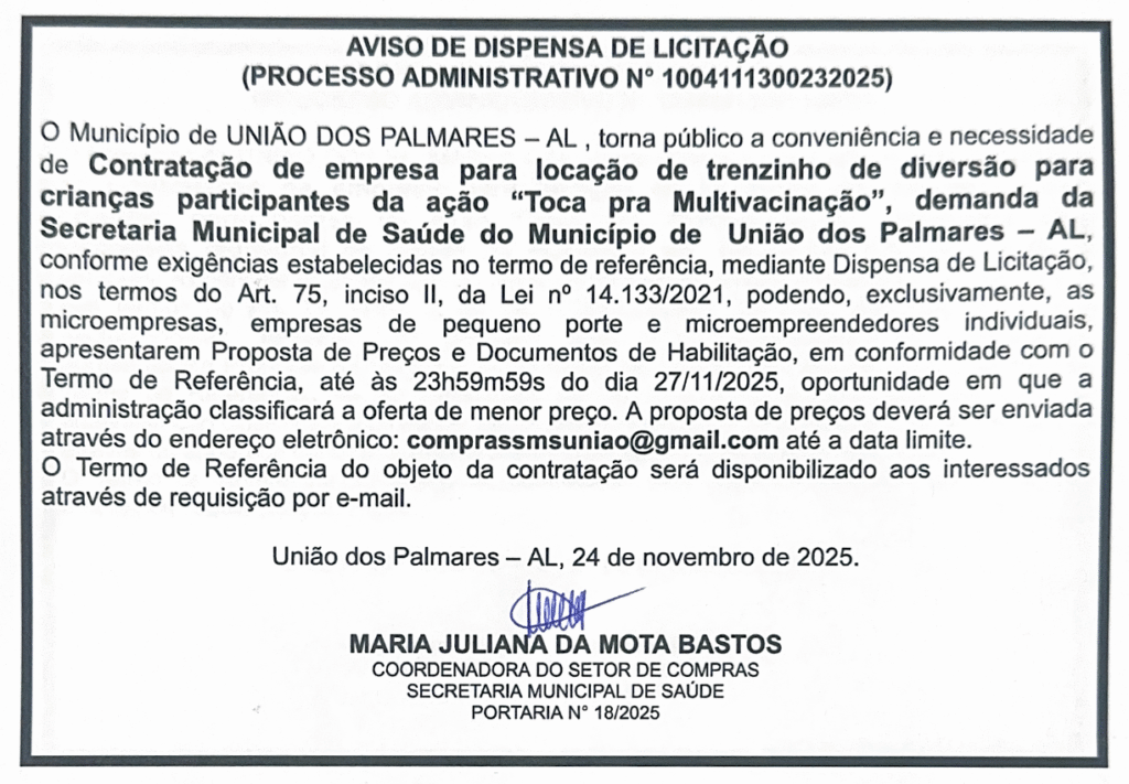 Procedimento: Credenciamento nº 04/2025 Objeto: Prestação de serviços por instituições financeiras ou bancárias, instituições de pagamento e cooperativas, legalmente autorizadas, interessadas na oferta de produtos de antecipação de salário, aos servidores da “Administração Direta e Indireta” da Prefeitura de União dos Palmares/AL – Data/Horário: 27 de NOVEMBRO de 2025 – Local: Rua Marechal Deodoro da Fonseca, s/n, Bairro Centro, Cidade União dos Palmares/AL, CEP 57.800-000 – Edital e Informações: No endereço acima, de 08:00 às 13:00 horas em dias úteis, ou mediante solicitação enviada ao e-mail: licitacoes@uniaodospalmares.al.gov.br.